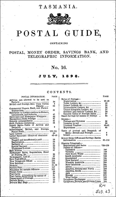 The Tasmanian Postal Guides include details of Postal and Stamp Duty Acts, postal rates, new routes, Post Office openings and closings for the year, Money Order and Telegraph services, related services and more. A careful reading of the guides will provide much useful information for those researching the postal and related services of the period.
